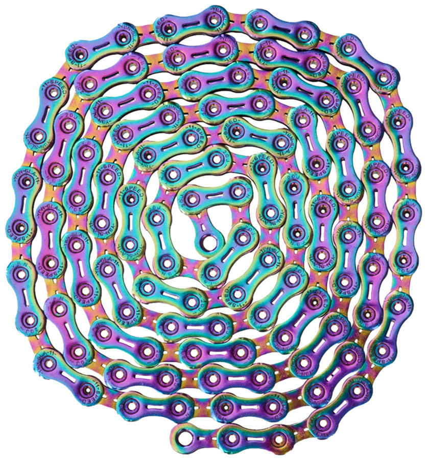 Offered here in the unique "Rainbow" (i.e. oil slick) finish that is unmistakable on the start line. Add a splash of color to your ride and stand out in a world of plain black and silver chains.